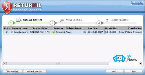 Returnil System Safe 2011 sẽ tự động ghi lại những thay đổi diễn ra trên hệ thống và tạo các điểm khôi phục phù hợp. Khi hệ thống gặp vấn đề, bạn nhấn Start ở mục Full Restore để xem danh sách các bản sao lưu, kèm theo thông tin chi tiết như ngày giờ, thời điểm quét và số lượng virus đã được phát hiện.
