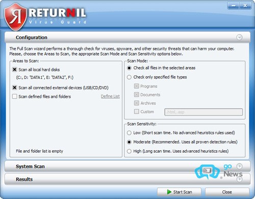 Để tiến hành quét sâu toàn bộ hệ thống, hãy nhấn Start ở mục Full Scan. Tại mục Areas to Scan, chọn các đối tượng cần quét: Scan all local hard disks (toàn bộ các ổ cứng), Scan all connected external devices (các thiết bị ngoại vi như USB, CD/DVD), hoặc Scan defined files and folders (các tập tin và thư mục được chỉ định).