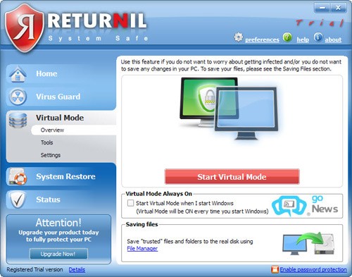Virtual Mode là một tính năng cho phép bạn nhanh chóng đưa hệ thống vào trạng thái bảo vệ, tương tự như việc “đóng băng” nó, mà không cần phải thực hiện khởi động lại máy tính (bằng cách chọn Start Virtual Mode).