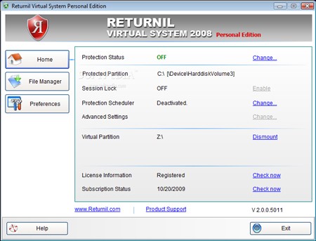 Returnil Virtual System 2008 Personal đảm bảo an toàn cho phân vùng hệ thống trong quá trình sử dụng internet.