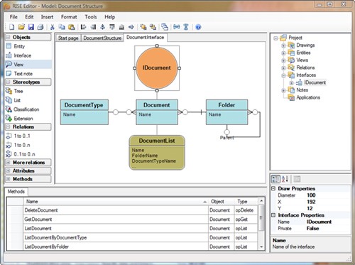 RISE hỗ trợ toàn diện phương pháp tiếp cận đồ họa, từ việc xây dựng mẫu thông tin đến thiết kế hệ thống kỹ thuật. Công cụ này tận dụng biểu đồ ERD (Entity Relationship Diagram) để trực quan hóa cấu trúc dữ liệu và mối quan hệ giữa các thực thể.