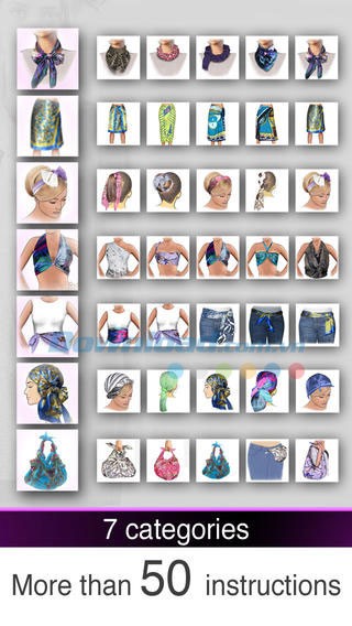 Ứng dụng liên tục được cập nhật để bắt kịp các xu hướng thời trang mới nhất. Bạn sẽ tìm thấy hướng dẫn thắt 50 kiểu quàng khăn độc đáo cho cổ, cùng 18 cách sáng tạo để sử dụng khăn quấn đầu, thắt eo, trang trí túi xách và áo choàng.