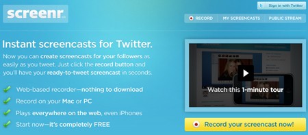 Một điểm cần lưu ý là thời lượng quay phim của Screenr bị giới hạn trong vòng 5 phút. Bên cạnh đó, việc tải video lên đòi hỏi bạn phải sở hữu một tài khoản Twitter (có thể đăng ký trực tiếp trên trang web của dịch vụ).