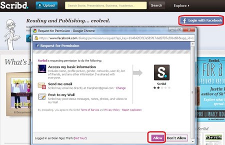 Để bắt đầu, hãy truy cập trang web chính thức của Scribd. Sau đó, chọn liên kết Login with Facebook. Một cửa sổ thông báo yêu cầu kết nối với tài khoản Facebook sẽ xuất hiện. Bạn chỉ cần nhấn vào Allow để ứng dụng Scribd được thêm vào tài khoản Facebook của mình.