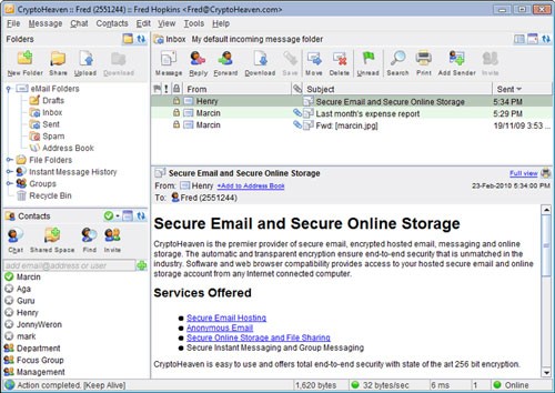 CryptoHeaven được biết đến là một trong những đơn vị tiên phong trong lĩnh vực cung cấp giải pháp bảo mật và mã hóa email. Công cụ mã hóa được tích hợp tự động, minh bạch của phần mềm này đảm bảo an toàn thông tin tuyệt đối, với cơ chế bảo vệ end-to-end (từ đầu đến cuối).