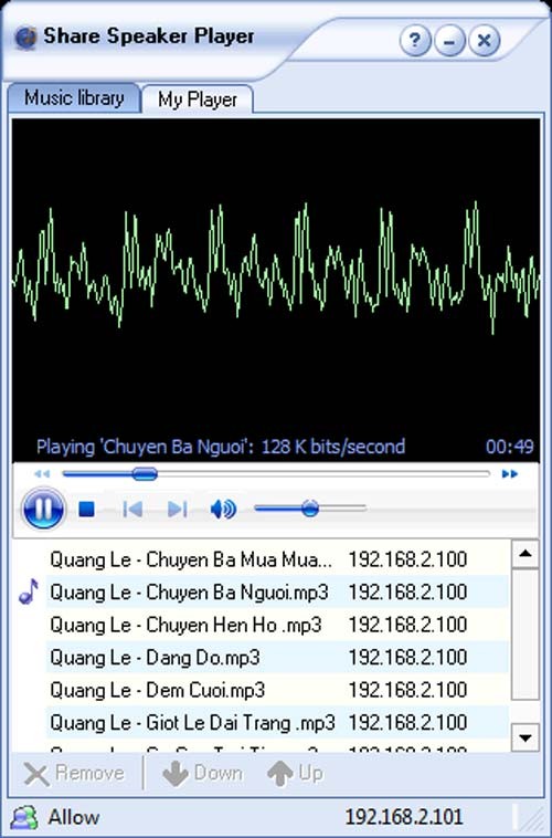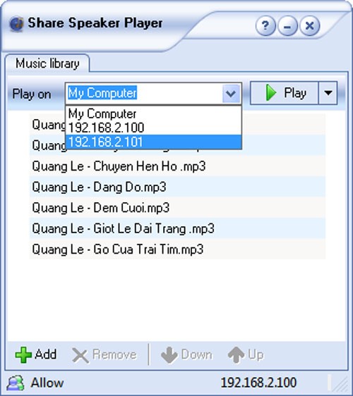 Các tệp nhạc đã chọn sẽ được hiển thị trên giao diện chính của Share Speaker Player. Bạn nhấp vào mũi tên thả xuống tại mục Play on và chọn địa chỉ IP của máy tính có loa được kết nối. Theo ví dụ trong bài viết, chúng ta chọn máy thứ hai với địa chỉ IP 192.168.2.101. Sau khi chọn, nhấn nút Play để bắt đầu phát nhạc.