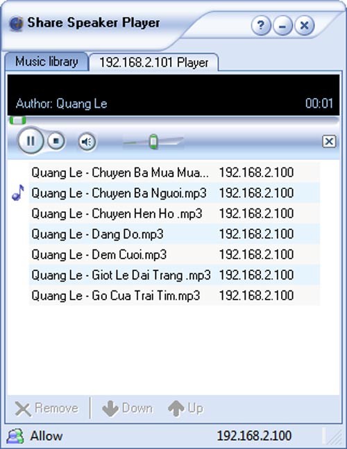 Trong quá trình phát nhạc, giao diện chương trình sẽ hiển thị thêm một tab có tên 192.168.2.101 Player, cho biết nhạc đang được phát qua loa của máy tính có địa chỉ IP 192.168.2.101. Tab này sẽ hiển thị danh sách các bài hát đã chọn, với biểu tượng nốt nhạc xuất hiện bên cạnh bài hát đang phát. Bạn có thể sử dụng các nút Pause hoặc Stop trên khung phát nhạc để tạm dừng hoặc dừng phát nhạc.