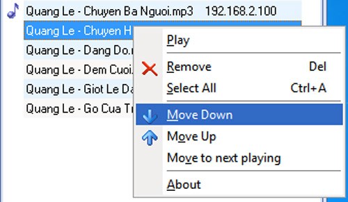 Để thay đổi thứ tự phát nhạc, bạn có thể nhấp chuột phải vào tên bài hát và chọn các tùy chọn sau: (đẩy bài hát xuống một vị trí), (đẩy bài hát lên một vị trí), (phát bài hát này sau bài hát hiện tại). Bạn cũng có thể nhấn Remove để xóa bài hát khỏi danh sách nhạc.
