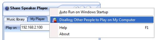 Nếu bạn không muốn máy thứ nhất sử dụng loa của máy thứ hai nữa, hãy nhấp chuột phải vào bất kỳ vị trí nào trên giao diện Share Speaker Player của máy thứ hai và chọn mục Disallow Other People to Play on My Computer. Khi đó, góc phải của giao diện chương trình sẽ hiển thị chữ Deny, cho biết các máy tính khác không thể sử dụng loa của máy thứ hai.