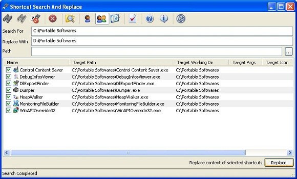 Phần mềm còn có chức năng tìm kiếm và thay thế đường dẫn của shortcut, rất hữu ích khi bạn sử dụng các phần mềm portable và muốn chuyển chúng giữa các ổ đĩa. Ví dụ, nếu bạn có các phần mềm portable trong C:\Portable Softwares và tạo shortcut của chúng trong Common Start Menu, bạn muốn chuyển tất cả sang ổ D:\Portable Softwares mà không cần chỉnh sửa từng shortcut.