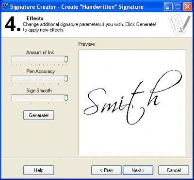 4. Hộp thoại Effects sẽ xuất hiện. Điều chỉnh lượng mực (Amount of Ink), độ chính xác của nét viết (Pen Accuracy) và độ mượt của chữ ký (Smooth of Signature) theo sở thích cá nhân. Nhấn Generate để xem trước kết quả. Nếu hài lòng, nhấn Next.