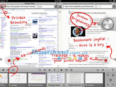 Ứng dụng hỗ trợ Facebook, Twitter, Instapaper và Read It Later (tính năng này đang trong giai đoạn thử nghiệm Beta).
