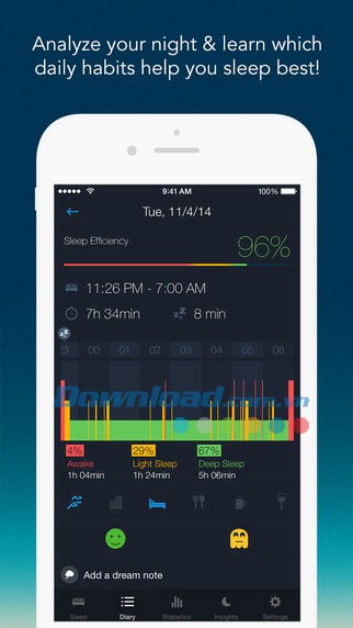 Ứng dụng còn ghi lại các hoạt động thường nhật và thói quen của người dùng, chẳng hạn như lượng caffeine và đồ uống có cồn tiêu thụ, cũng như mức độ căng thẳng trong công việc. Điều này giúp xác định các yếu tố có thể tác động đến chất lượng giấc ngủ.