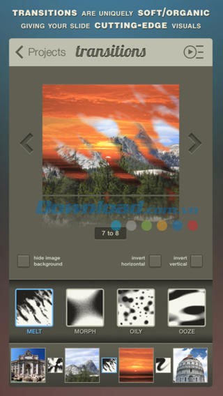 Các hiệu ứng chuyển đổi giữa các hình ảnh được xây dựng với phong cách riêng biệt, lấy cảm hứng từ các hiện tượng tự nhiên và các vật thể quen thuộc như vụ nổ, các yếu tố khí hậu, thời tiết, plasma, sự xói mòn, hành trình, hơi nước,... Đây là một giải pháp tối ưu để tạo điểm nhấn cho các buổi trình chiếu ảnh của bạn bằng những hiệu ứng trực quan và đầy sáng tạo.