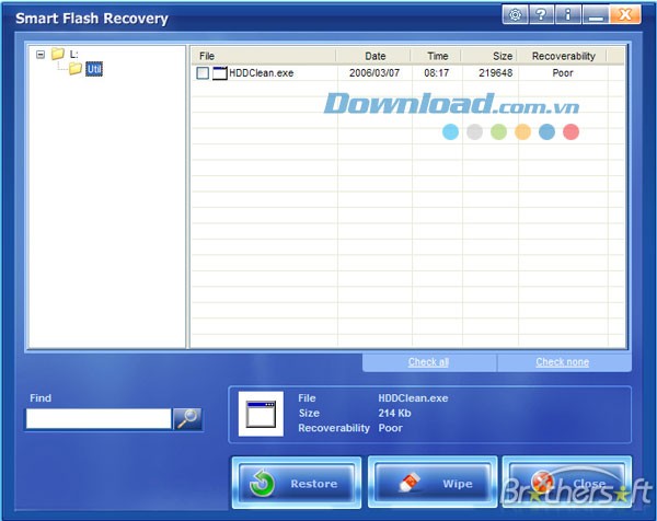 Chức năng Options cho phép bạn chỉ định thư mục lưu trữ các file đã phục hồi (thư mục mặc định là C:\Program Files\Smart Flash Recovery). Trong khi đó, Browse và Find có tính năng tương tự nhau, giúp bạn tìm kiếm và khôi phục các file trên ổ Flash.