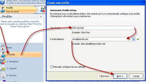 Đầu tiên, bạn cần thiết lập thông tin cá nhân và email cho phần mềm bằng cách chọn mục 1 "Profile" ở cột bên trái. Một hộp thoại sẽ xuất hiện. Trong hộp thoại này, nhập tên của bạn vào phần Your Name, địa chỉ email của bạn vào phần E-mail Address, sau đó nhấn nút Next.