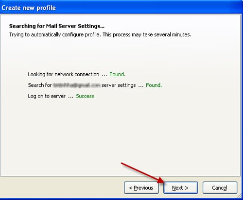 Phần mềm sẽ tự động tìm kiếm máy chủ email của bạn thông qua kết nối internet. Sau khi kết nối và đăng nhập thành công, nhấn nút Next để tiếp tục.