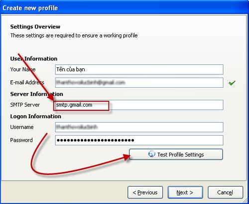 Phần mềm sẽ tự động nhận dạng địa chỉ email bạn nhập để xác định máy chủ SMTP. Nếu bạn sử dụng dịch vụ email riêng, hãy nhập lại địa chỉ SMTP vào mục SMTP Server của hộp thoại tiếp theo. Sau đó, kiểm tra lại tất cả thông tin và nhấn nút Test Profile Settings để kiểm tra kết nối. Nếu thành công, thông báo sẽ hiển thị sau khi kiểm tra, đồng thời một email xác nhận sẽ được gửi đến địa chỉ email bạn đã khai báo.
