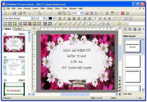 Nếu bạn đã quen thuộc với các công cụ và tính năng của TextMaker 2010 hoặc PlanMaker 2010, việc thao tác trên SoftMaker Presentations sẽ trở nên dễ dàng hơn. Phần mềm cung cấp một thư viện hiệu ứng đa dạng, giúp bạn tạo ra những bài thuyết trình sinh động và thu hút. Mặc dù số lượng hiệu ứng có thể không nhiều bằng Microsoft PowerPoint, nhưng vẫn đủ để đáp ứng nhu cầu trình bày của bạn.