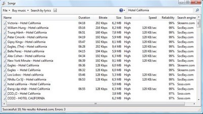 Danh sách các bài hát tìm kiếm được sẽ hiển thị ở khung bên dưới, kèm theo dung lượng file, công cụ tìm kiếm và tần số bitrate. Bạn có thể nhập tên bài hát cùng với tên nghệ sĩ để có kết quả chính xác hơn.