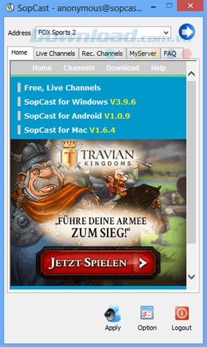 Quá trình cài đặt sau khi hoàn tất sẽ hiển thị giao diện chính của SopCast khi khởi động như sau: