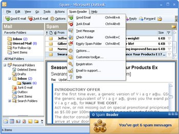 Spam Reader được tích hợp hoàn toàn vào MS Outlook, do đó bạn không cần phải khởi chạy một chương trình độc lập. Sau khi hoàn tất cài đặt, một thanh công cụ mới và một mục mới sẽ được thêm vào menu chính của Outlook.