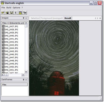 Startrails cung cấp khả năng tải ảnh lên và lựa chọn các khung màu tối tùy theo ý muốn. Người dùng có thể loại bỏ một số hình ảnh khỏi quá trình xử lý bằng cách bỏ chọn chúng.