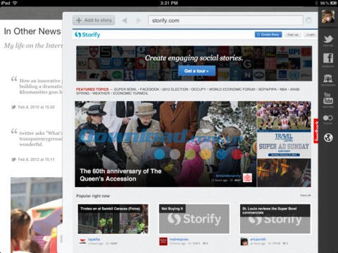 Storify for iPad cho phép người dùng thu thập các dữ liệu chọn lọc từ nhiều mạng xã hội khác nhau để xây dựng câu chuyện cá nhân, kết hợp các sự kiện rải rác trên web thành một ý tưởng thống nhất.