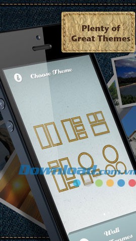 - Người dùng có thể chọn từ 76 bố cục ảnh được thiết kế sẵn, hoặc lựa chọn trong 7 chủ đề khác nhau như: cổ điển, hoạt hình, Facebook, điện ảnh, Honeycomb, Polaroid, và Wall of Frames.