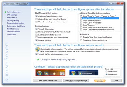 Với Sunrise Seven, người dùng có thể thay đổi cách Windows 7 vận hành, bao gồm các cài đặt liên quan đến UAC (User Account Control), hiệu năng hệ thống, mức độ bảo mật, trình duyệt Explorer, menu Start, và thậm chí cả thông tin OEM.