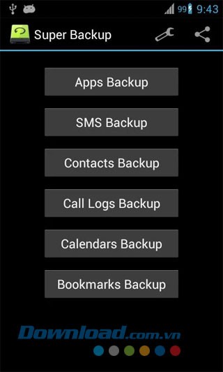 Với Super Backup, việc sao lưu các dữ liệu cá nhân như danh bạ, tin nhắn SMS và lịch sử cuộc gọi trở nên dễ dàng hơn bao giờ hết. Tất cả dữ liệu được lưu trữ an toàn trên thẻ SD.