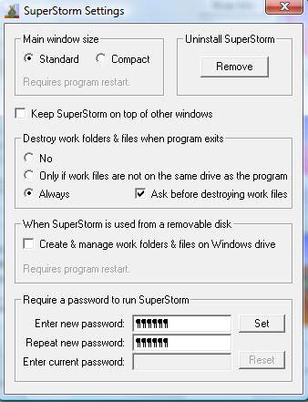 Bạn có thể đặt mật khẩu để hạn chế quyền truy cập vào chương trình, tăng cường bảo mật. Tuy nhiên, tính năng bảo vệ bằng mật khẩu cho dữ liệu ẩn chỉ có trong phiên bản trả phí. Để đặt mật khẩu cho SuperStorm, vào Settings, điền mật khẩu vào các ô tương ứng và nhấn Set. Để gỡ bỏ mật khẩu, nhập mật khẩu hiện tại vào ô Enter Current Password và nhấn Reset.