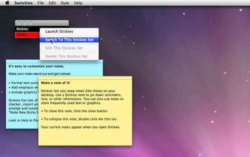 Switchies cho phép người dùng tổ chức các cửa sổ Stickies thành nhiều nhóm khác nhau. Việc chuyển đổi giữa các nhóm này trở nên dễ dàng hơn bao giờ hết. Chỉ cần nhấp chuột phải vào một mục và chọn Switch To This Stickies Set.