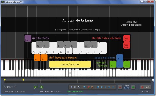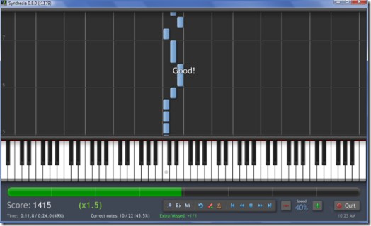 Khi mới làm quen với Synthesia, tốt nhất là giảm tốc độ xuống khoảng 30% đến 40%. Trong thanh công cụ ở dưới cùng của cửa sổ, bạn có thể thay đổi chế độ zoom bàn phím, hiển thị nhãn trên các nốt nhạc, hiển thị nhãn trên các phím, đặt chế độ lặp lại bài hát, thiết lập và chỉnh sửa bookmarks, cũng như các nhịp. Bạn cũng có thể tạm dừng, tua lại, tua nhanh, quay lại hoặc chuyển đến bookmarks trong bài hát.