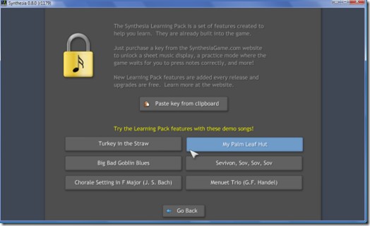 Trong Learning Pack Demo, bạn có thể thử nghiệm các tính năng không có trong phiên bản miễn phí của Synthesia. Chọn một bài hát và chọn Played by You trên cả hai thanh màu xanh lá cây và màu xanh lam. Bạn cũng có thể chọn Sheet Music, một tính năng khác chỉ có trong Learning Pack.