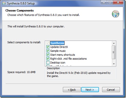 Trong quá trình cài đặt chương trình, hãy đảm bảo các tùy chọn Update DirectX , Sample music, phím tắt Start menu và biểu tượng Desktop đều được chọn. Nếu bạn muốn Synthesia hiển thị trong Context menu khi nhấp chuột phải, hãy chọn Right-click .mid file associations.