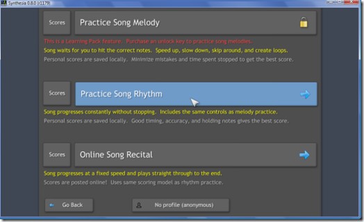Trong phiên bản miễn phí của phần mềm, hầu hết các bài hát MIDI chỉ cho phép sử dụng hai chế độ luyện tập là và . Chức năng Practice Song Melody sẽ chờ bạn nhấn phím chính xác trước khi tiếp tục bài hát, nhưng tính năng này chỉ được mở khóa khi bạn mua bản đầy đủ. Tuy nhiên, Learning Pack Demo của Synthesia cho phép bạn trải nghiệm tính năng này trên sáu bài hát khác nhau.