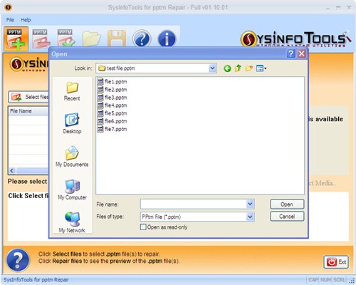 SysInfoTools MS PowerPoint Pptm Recovery có thể mở các file Pptm bị lỗi và tiến hành sửa chữa dữ liệu đã chọn. Quá trình này giúp khắc phục các vấn đề do nhiều nguyên nhân gây ra, chẳng hạn như sự tấn công của virus hoặc việc tắt máy tính đột ngột trong quá trình lưu file.