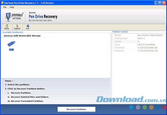Khi một ổ đĩa rời, ví dụ như Pen Drive, được chọn, tất cả thông tin chi tiết về phân vùng sẽ được trình bày.