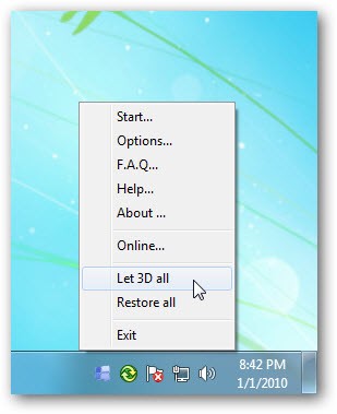 Chuyển sang chế độ 3D chỉ với một cú nhấp chuột phải vào biểu tượng chương trình trên khay hệ thống, sau đó chọn "Let 3D All". Các cửa sổ 2D sẽ ngay lập tức chuyển đổi sang dạng 3D trên desktop.