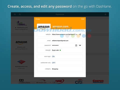 Dashlane hỗ trợ người dùng quản lý mật khẩu và thông tin cá nhân một cách hiệu quả trên các trang web. Nhờ Dashlane, bạn sẽ giảm thiểu tối đa việc nhập liệu thủ công trên bàn phím nhỏ của iPhone, từ đó có thể tự động đăng nhập và điền các biểu mẫu một cách nhanh chóng. Ứng dụng còn cung cấp khả năng tạo ra các mật khẩu mạnh mẽ để tăng cường bảo mật. Bạn có thể truy cập dữ liệu của mình ở bất cứ đâu, dù là tại nhà, nơi làm việc hay khi đang di chuyển.