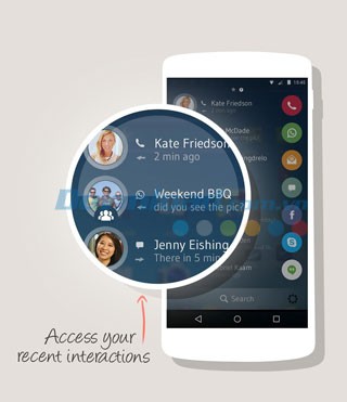 Drupe tập trung tất cả các ứng dụng liên lạc vào một vị trí duy nhất, giúp mọi thao tác trở nên dễ dàng hơn. Bạn chỉ cần chọn một liên hệ và kéo nó đến ứng dụng mong muốn như SMS, Facebook Messenger, Skype, hoặc thực hiện cuộc gọi.