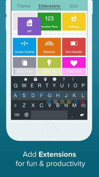 Bạn có thể tận dụng các Fleksy Extension như: GIFs (ảnh GIF động), Hotkeys (phím tắt), Number Row (bàn phím số), Cursor Control (điều khiển con trỏ), One-Handed Typing (gõ một tay), Rainbow Key Pops (hiệu ứng bàn phím cầu vồng) và nhiều tiện ích khác.