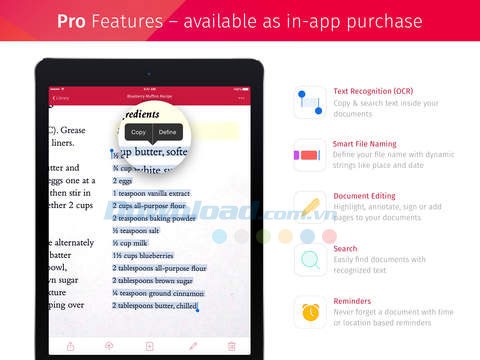 Bản scan đã được nhận diện ký tự. Để truy cập nội dung, nhấn nút Scan trong danh sách để xem tài liệu. Nhấn vào nút ở giữa màn hình để hiển thị các ký tự đã được nhận diện.