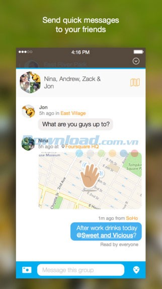 Bạn muốn tìm bạn bè để gặp gỡ? Mở ứng dụng Swarm là bạn có thể nhanh chóng xem những ai đang ở gần đó. Bạn muốn thông báo về hoạt động hiện tại của mình? Swarm giúp bạn chia sẻ vị trí một cách nhanh chóng và thú vị hơn. Bạn có ý tưởng cho một buổi gặp mặt chung? Hãy gửi tin nhắn đến những người bạn gần đó để cùng nhau lên kế hoạch!