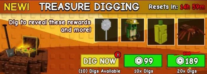 Mỗi 5 phút, bạn sẽ nhận thêm một lượt đào, tăng cơ hội tìm kiếm phần thưởng. Sự kiện sẽ được làm mới hàng ngày; tuy nhiên, nếu đã hoàn thành, người chơi có thể khởi động lại bằng cách trả 1 nghìn tỷ Sheckles hoặc 59 Robux.