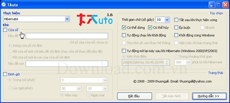 Ngoài ra, TAuto còn có khả năng thiết lập thời gian khởi động lại máy sau khi sử dụng chế độ Hibernate. Phần mềm này có thể tự động thực hiện các thao tác sau: