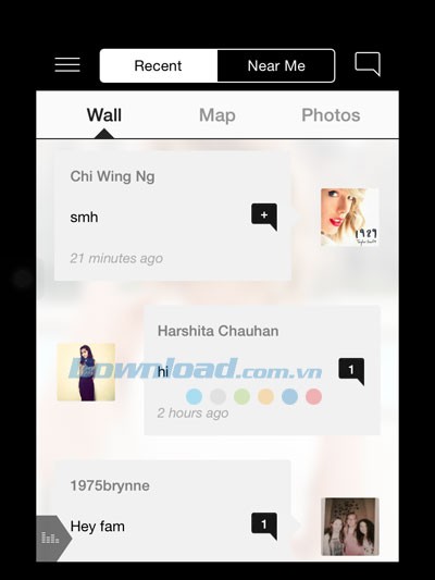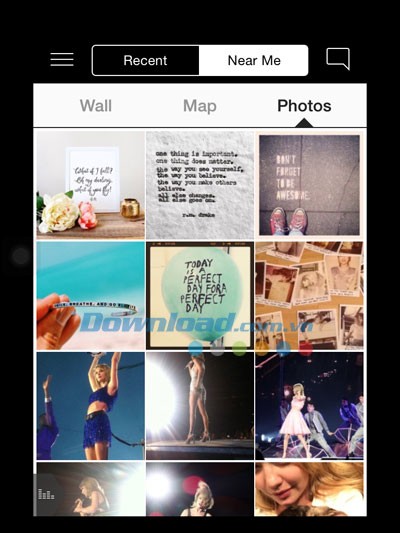 Mục Chat là nơi các fan có thể chia sẻ những câu chuyện, hình ảnh đẹp từ các tour diễn… Bạn cũng có thể tìm kiếm những người hâm mộ khác ở gần bạn thông qua thẻ Near Me hoặc xác định vị trí trên bản đồ.
