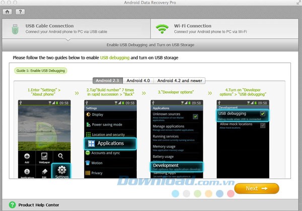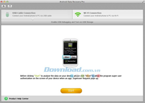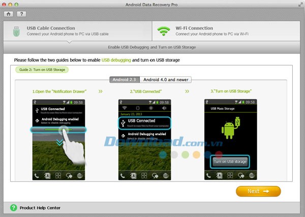 Để kết nối thiết bị Android với máy tính, bạn có thể sử dụng cáp USB. Hãy thực hiện theo các bước sau. Lưu ý, không được ngắt kết nối thiết bị trong suốt quá trình quét, nếu không quá trình quét sẽ không thành công.