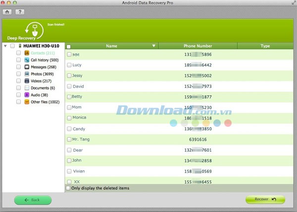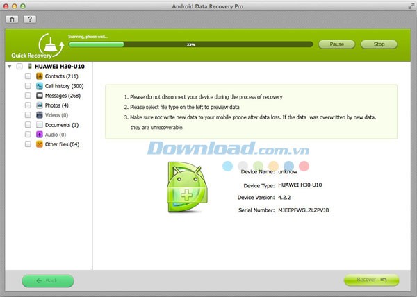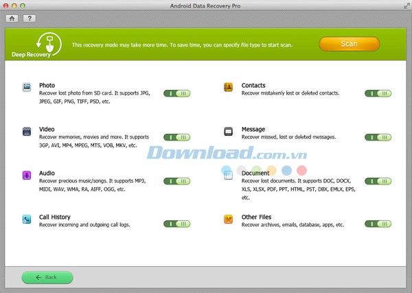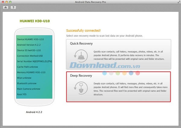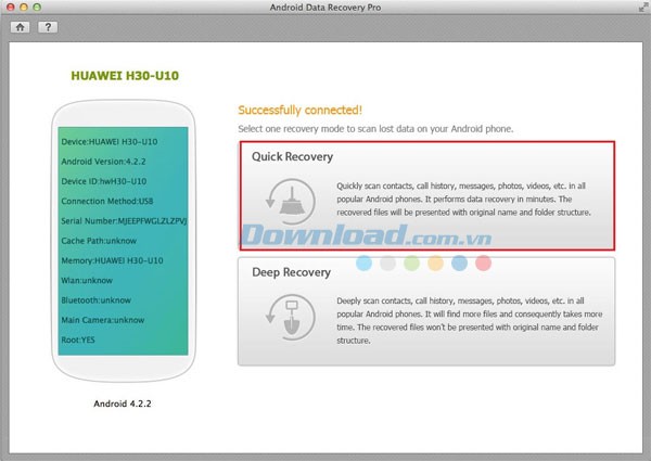 Sau khi kết nối thiết bị Android với máy Mac, bạn có thể bắt đầu quét thiết bị. Chương trình cung cấp hai chế độ phục hồi: Quick Recovery và Deep Recovery.